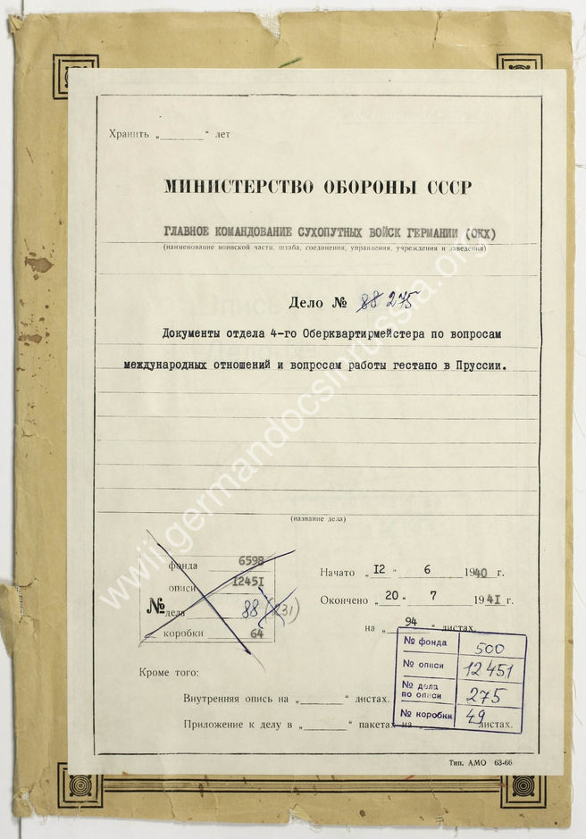 Top CAMO - Bestand 500 Findbuch 12451 - Oberkommando des Heeres (OKH) Akte 275. Handakten des Ic der Heeresgruppe B: Deutsch-französisch...