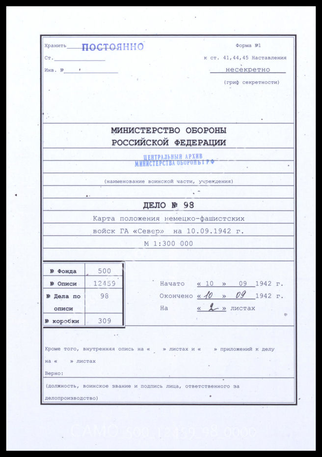 Akte 98. Unterlagen der Operationsabteilung IIIb des Generalstabs des Heeres bei OKH: Lagekarte der Heeresgruppe Nord – Stand 10.9.1942, M 1:300.000, einschließlich Übersicht der eingesetzten Kräfte.