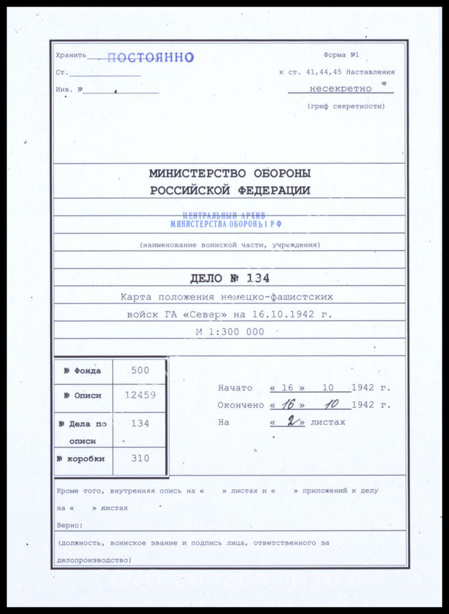Akte 134. Unterlagen der Operationsabteilung IIIb des Generalstabs des Heeres bei OKH: Lagekarte der Heeresgruppe Nord – Stand 16.10.1942, M 1:300.000, einschließlich Übersicht der eingesetzten Kräfte.