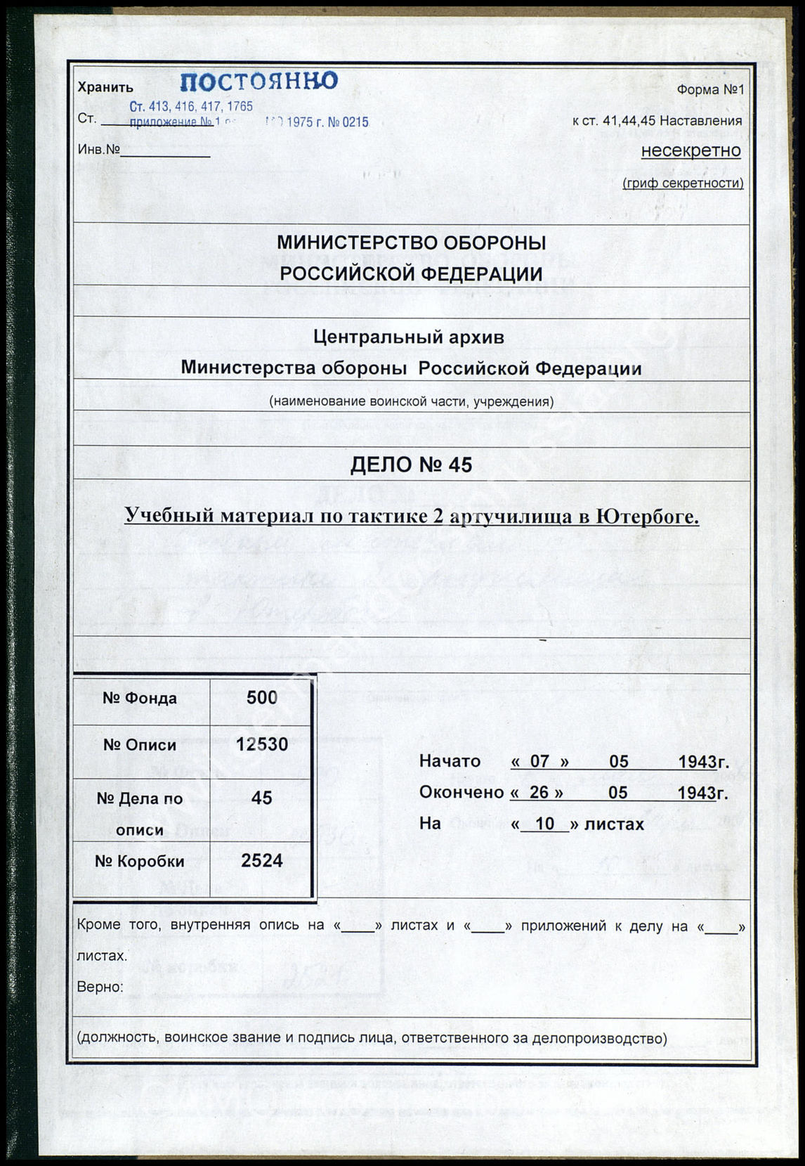Top CAMO - Bestand 500 Findbuch 12530 - Schulen und Lehreinrichtungen von Wehrmacht und Wa... Akte 45. Unterlagen der Artillerieschule II Jüterbog / Lehrstab A...