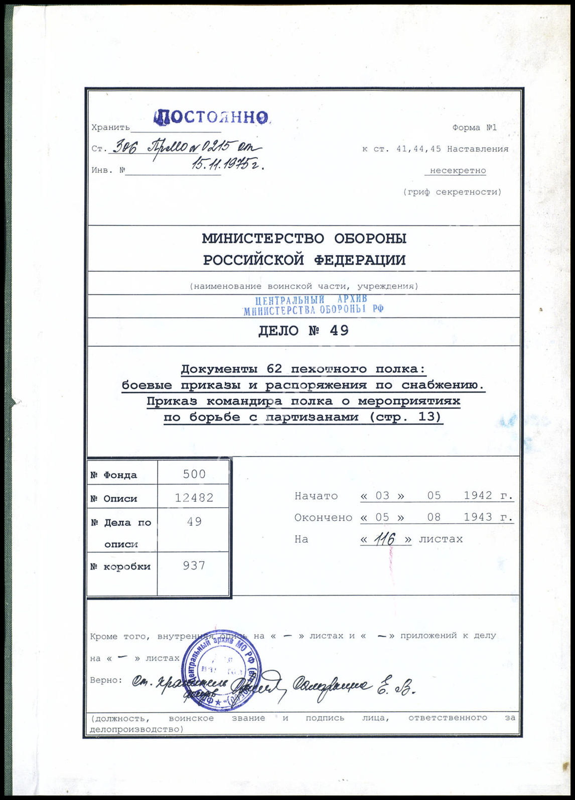 Akte 49. Unterlagen der Ia-Abteilung der 13. Kompanie des Infanterieregiments 62: Tagesbefehle der Ia-Abteilung und der IIa-Abteilung des Regiments, Sonderbefehle u.a.