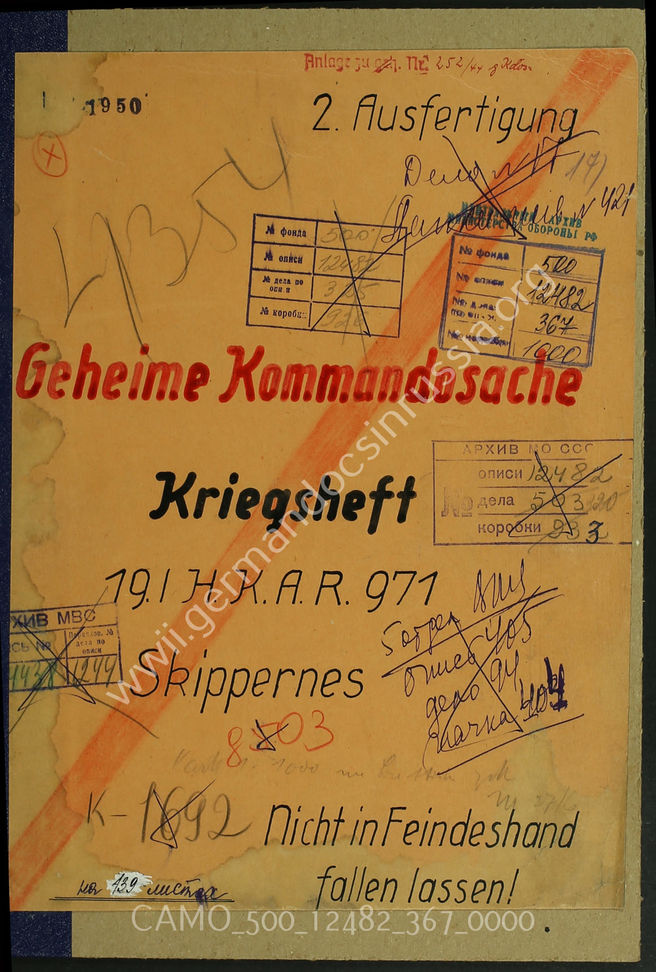 Akte 367. Unterlagen der Ia-Abteilung der 19. Batterie des Heeres-Küsten-Artillerieregiments 971: Kriegsheft der 19. Batterie des Regiments in Skippernes (Norwegen) – Kampfanweisung für die Batterie, Merkblätter, Kartenskizzen u.a.