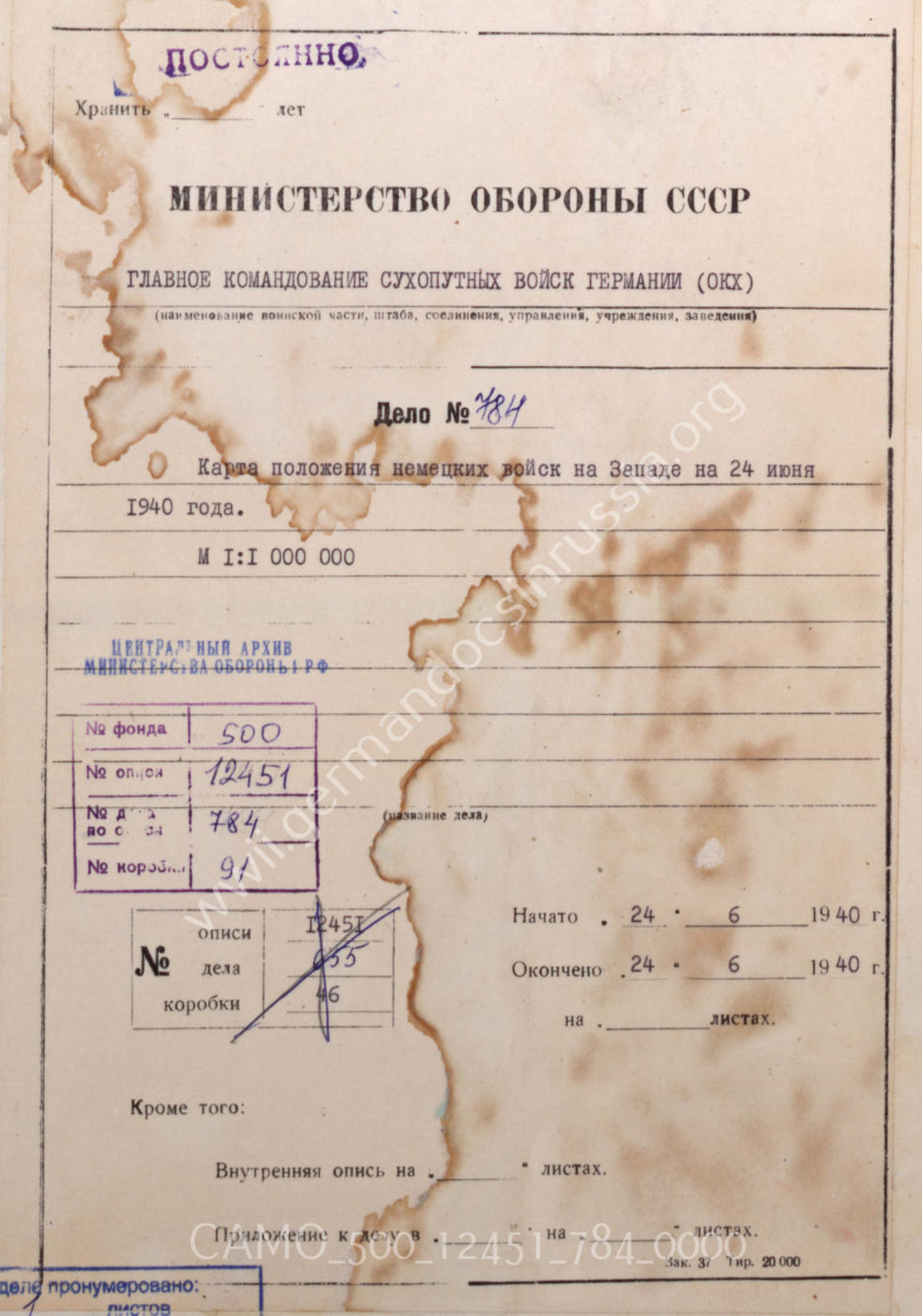Akte 784. Unterlagen der Operationsabteilung des OKH: Karte zur Lage während des Westfeldzuges – Stand 24.6.1940 ; M 1:1.000.000.