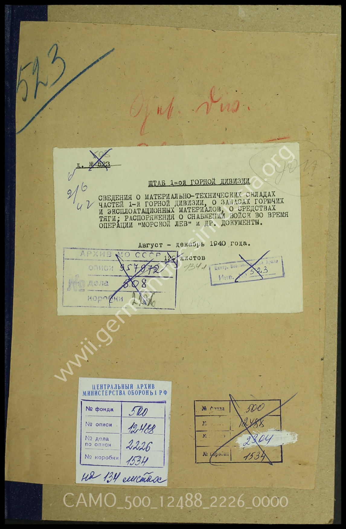 Top CAMO - Bestand 500 Findbuch 12488 - Unterlagen Operation "Seelöwe" Akte 2226: Unterlagen der V-Abteilung der 1. Gebirgsdivision: Weisu...