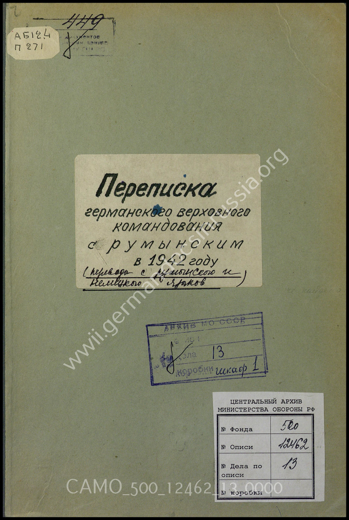 Akte 13: Unterlagen der kriegsgeschichtlichen Verwaltung des Generalstabes der Streitkräfte der UdSSR: Schriftwechsel des deutschen Oberkommandos mit dem rumänischen im Jahr 1942, 4.11.1942-31.12.1942