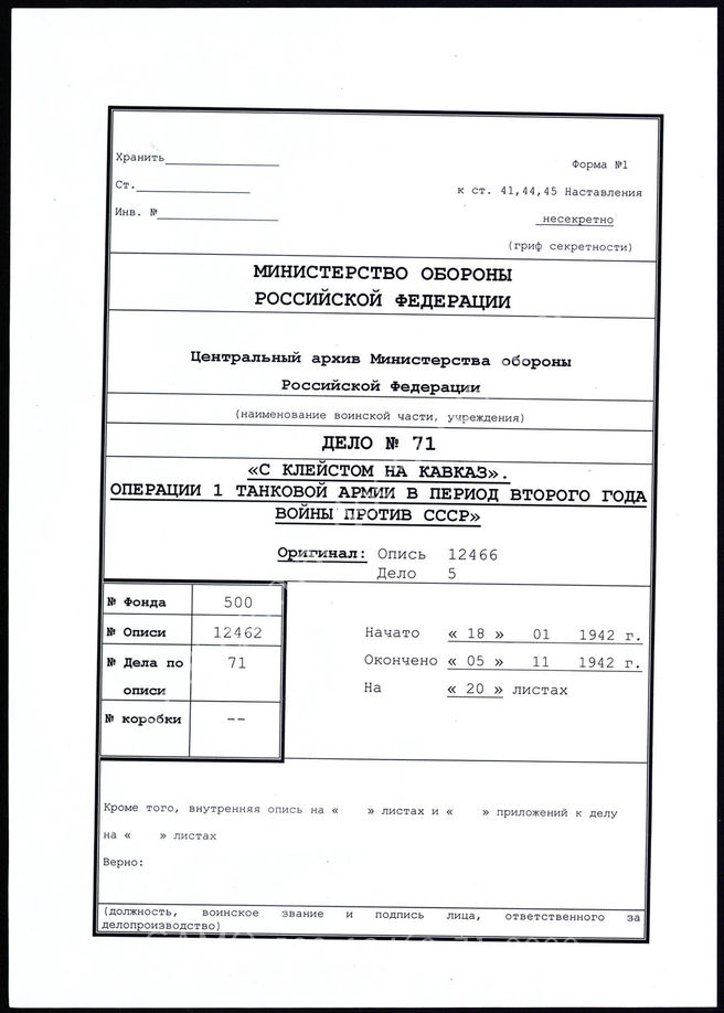Akte 71: Unterlagen der kriegsgeschichtlichen Verwaltung des Generalstabes der Streitkräfte der UdSSR: Übersetzung der Studie der 1. Panzerarmee „Mit Kleist durch den Kaukasus. Die Operationen der 1. Panzerarmee im zweiten Kriegsjahr gegen Russland“, 1943