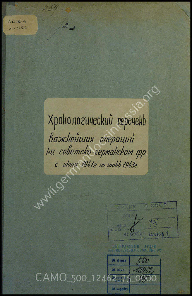 Akte 75: Unterlagen der kriegsgeschichtlichen Verwaltung des Generalstabes der Streitkräfte der UdSSR: Übersetzung einer chronologischen Aufstellung der wichtigen Operationen von Wehrmacht und Roter Armee an der deutsch-sowjetischen Front