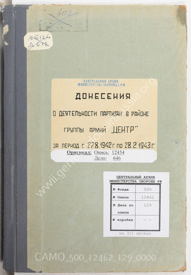 Akte 129: Unterlagen der kriegsgeschichtlichen Verwaltung des Generalstabes der Streitkräfte der UdSSR: Übersetzung von Unterlagen des Ic der Heeresgruppe Mitte – Ic-Bandenmeldungen (27.8.42-28.2.43)
