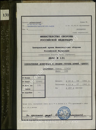 Akte 131: Unterlagen der kriegsgeschichtlichen Verwaltung des Generalstabes der Streitkräfte der UdSSR: Übersetzung von Unterlagen des Ia der Heeresgruppe Mitte – Morgen-, Zwischen- und Tagesmeldungen des Ia der Heeresgruppe Mitte, 22.6.1941-13.7.1941