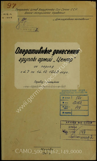 Akte 149: Unterlagen der kriegsgeschichtlichen Verwaltung des Generalstabes der Streitkräfte der UdSSR: Übersetzung von Dokumenten aus den Anlagen zum KTB der Führungsabteilung der Heeresgruppe Mitte – Akte XVIII, 4.7.1943-14.10.1943