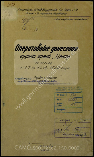 Akte 150: Unterlagen der kriegsgeschichtlichen Verwaltung des Generalstabes der Streitkräfte der UdSSR: Übersetzung von Dokumenten aus den Anlagen zum KTB der Führungsabteilung der Heeresgruppe Mitte – Akte XVIII, 4.7.1943-14.10.1943 – 2. Exemplar