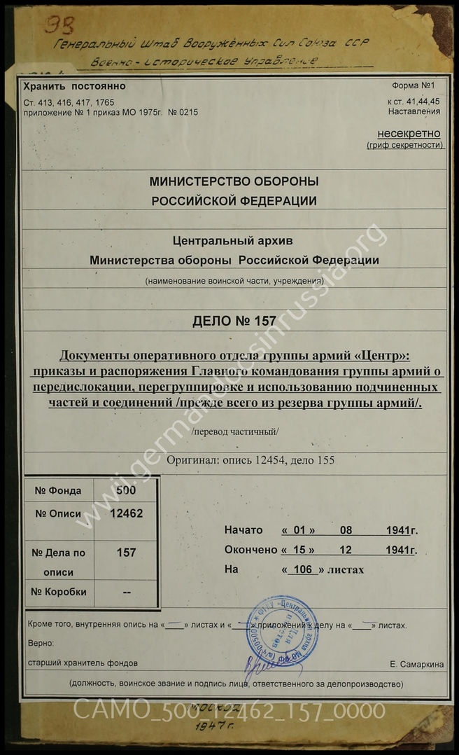 Top CAMO - Bestand 500 Findbuch 12462 - russische Übersetzungen deutscher Akten Akte 157: Unterlagen der kriegsgeschichtlichen Verwaltung des Gener...