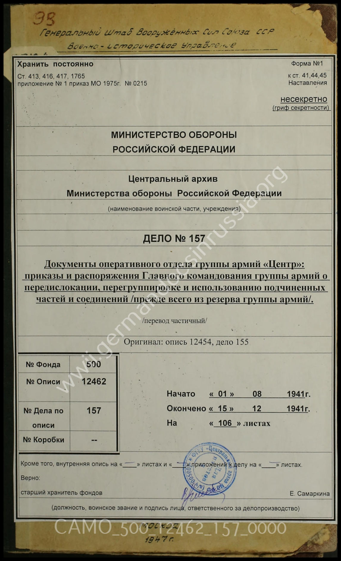 Akte 157: Unterlagen der kriegsgeschichtlichen Verwaltung des Generalstabes der Streitkräfte der UdSSR: teilweise Übersetzung von Dokumenten aus den Anlagen zum KTB der Führungsabteilung der Heeresgruppe Mitte – Akte II, Heft 2, 1.8.1941-15.12.1941