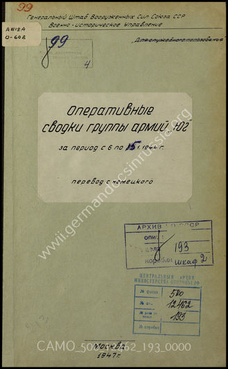Akte 193: Unterlagen der kriegsgeschichtlichen Verwaltung des Generalstabes der Streitkräfte der UdSSR: Übersetzung von Unterlagen der Ia-Abteilung der Heeresgruppe Süd – Lagemeldungen der Heeresgruppe Süd, 6.1.1944-15.1.1944 – 2. Exemplar