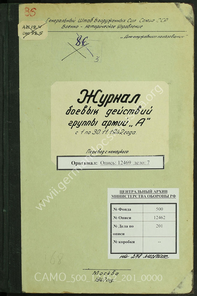 Akte 201: Unterlagen der kriegsgeschichtlichen Verwaltung des Generalstabes der Streitkräfte der UdSSR: Übersetzung von Unterlagen der Ia-Abteilung der Heeresgruppe A – KTB des Oberkommandos der Heeresgruppe A, Band 1, Teil 5, 1.11.1942-30.11.1942