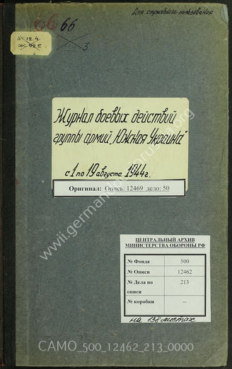 Akte 213: Unterlagen der kriegsgeschichtlichen Verwaltung des Generalstabes der Streitkräfte der UdSSR: Übersetzung von Unterlagen der Ia-Abteilung der Heeresgruppe Südukraine – KTB der Heeresgruppe Südukraine, Band 3, Teil 11, 1.8.1944-19.8.1944