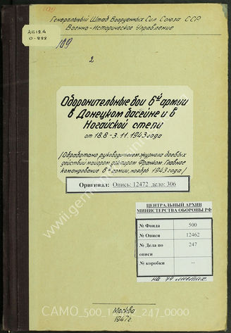 Akte 247: Unterlagen der kriegsgeschichtlichen Verwaltung des Generalstabes der Streitkräfte der UdSSR: Übersetzung von Unterlagen der Ia-Abteilung des AOK 6 – Darstellung der Abwehrschlachten im Donezbecken und der Nogaischen Steppe, 18.8.1943-3.11.1943