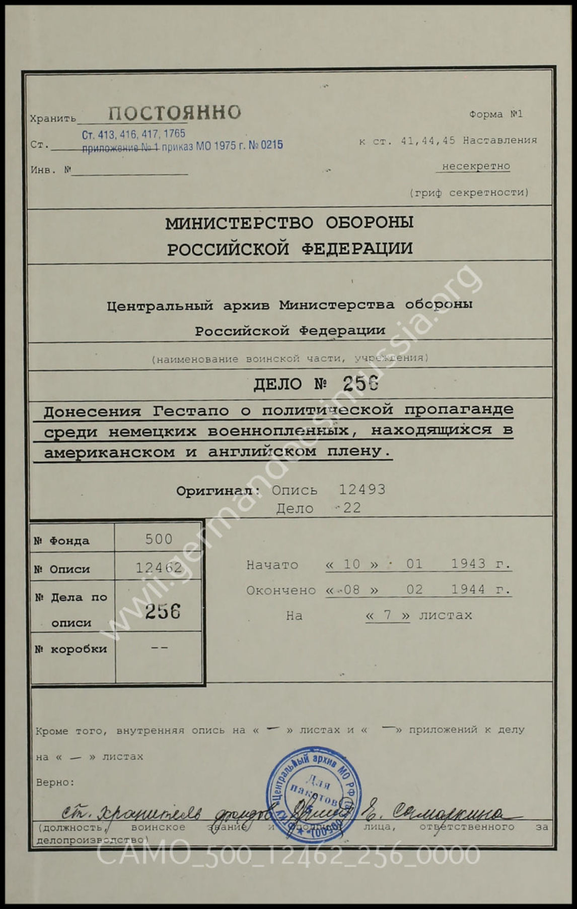 Akte 256: Unterlagen des Übersetzungsbüros des 6. Archivdepots des CAMO:. Übersetzung von Unterlagen des Amtes IVa1 des RSHA, 10.1.1943-8.2.1944