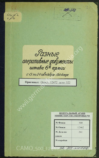 Top CAMO - Bestand 500 Findbuch 12462 - russische Übersetzungen deutscher Akten Akte 261: Unterlagen der kriegsgeschichtlichen Verwaltung des Gener...
