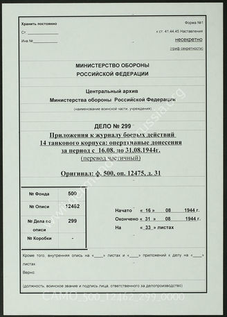 Akte 299: Unterlagen der kriegsgeschichtlichen Verwaltung des Generalstabes der Streitkräfte der UdSSR: teilweise Übersetzung von Unterlagen der Ia-Abteilung des Generalkommandos des XIV. Panzerkorps – Anlagen zum KTB Nr. 7, 16.8.1944-31.8.1944