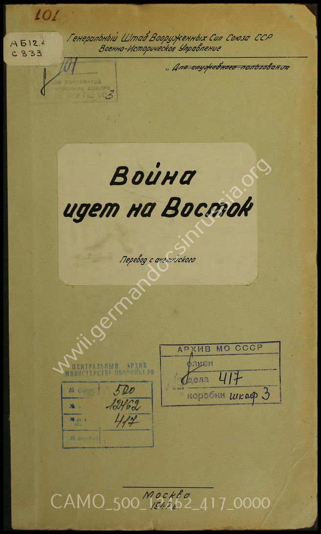 Akte 417: Unterlagen der kriegsgeschichtlichen Verwaltung des Generalstabes der Streitkräfte der UdSSR: Übersetzung des englischsprachigen Buches „The War goes East“ (?)