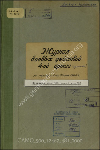 Akte 481: Unterlagen der kriegsgeschichtlichen Verwaltung des Generalstabes der Streitkräfte der UdSSR: KTB der 4. rumänischen Armee, 1.6.1944-30.6.1944