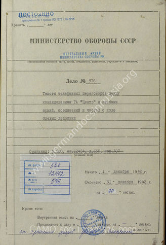 Akte 576:Unterlagen der kriegsgeschichtlichen Verwaltung des Generalstabes der Streitkräfte der UdSSR: Übersetzung von Unterlagen der Ia-Abteilung der Heeresgruppe Mitte – Mitgehörte Funksprüche der Besatzung von Welikie Luki u.a., 1.12.1942-1.1.1943