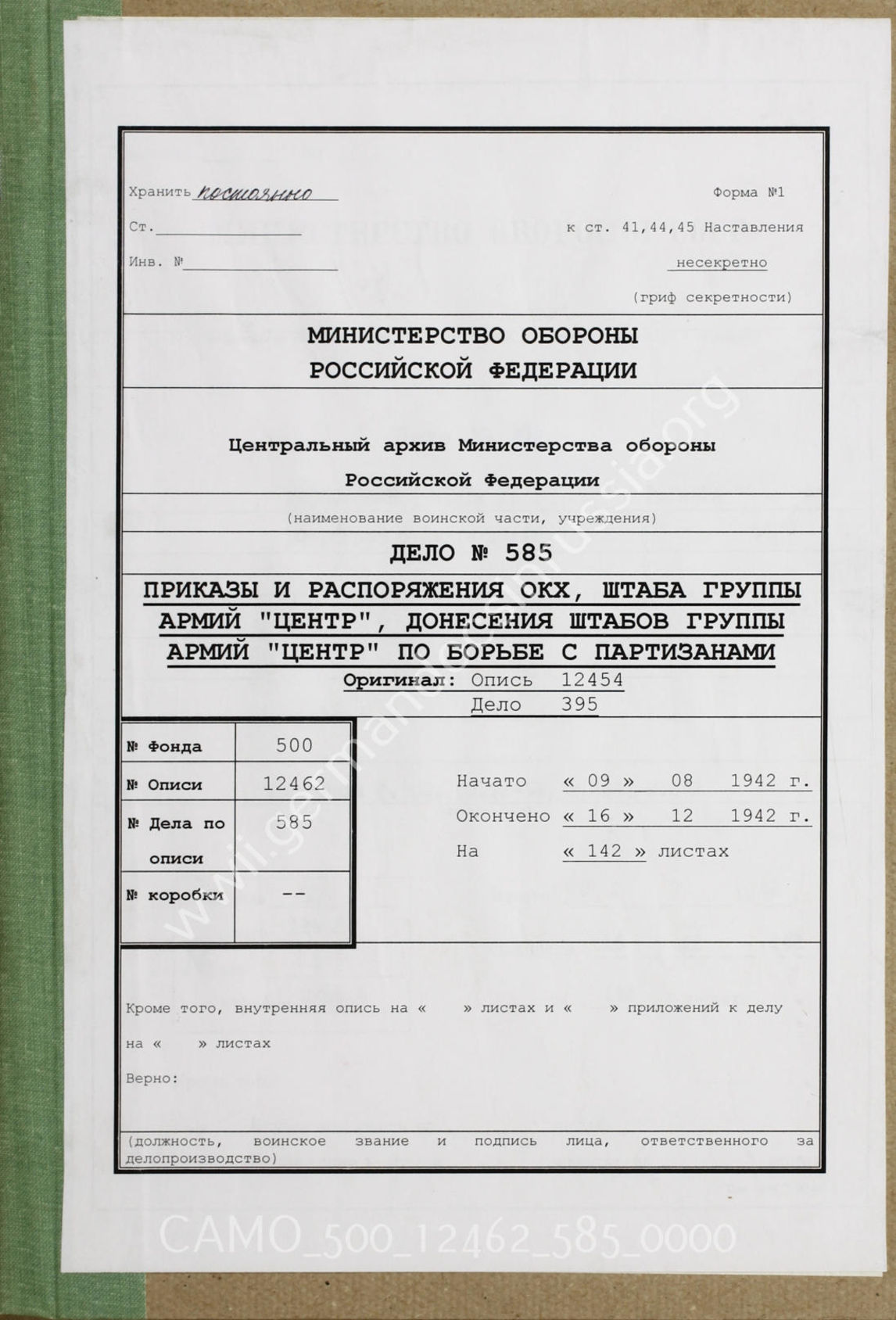 Akte 585: Unterlagen der kriegsgeschichtlichen Verwaltung des Generalstabes der Streitkräfte der UdSSR: Übersetzung von Anlagen zum KTB der Heeresgruppe Mitte – Führungsabteilung – Akte XXII: Bandenbekämpfung, Heft 4 vom 1.11.1942-30.11.1942