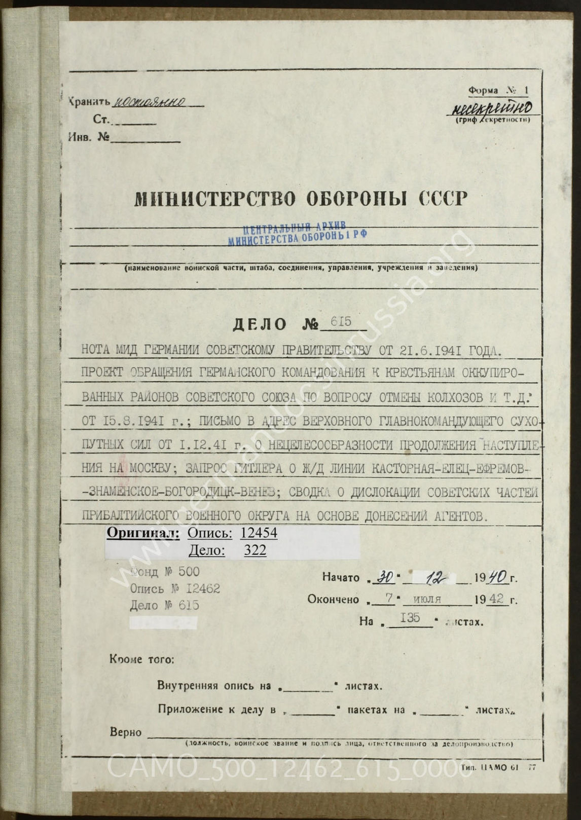 Top CAMO - Bestand 500 Findbuch 12462 - russische Übersetzungen deutscher Akten Akte 615: Unterlagen der kriegsgeschichtlichen Verwaltung des Gener...