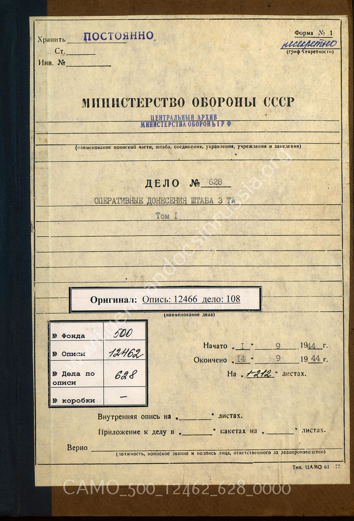 Akte 628: Unterlagen der kriegsgeschichtlichen Verwaltung des Generalstabes der Streitkräfte der UdSSR: Übersetzung von Unterlagen der Ia-Abteilung des PzAOK 3: Morgen-, Zwischen- und Tagesmeldungen des PzAOK 3 u.a., 1.9.1944-30.9.1944, Bd. 1 und Bd. 2