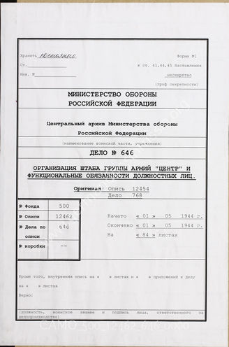 Akte 646: Unterlagen der kriegsgeschichtlichen Verwaltung des Generalstabes der Streitkräfte der Russischen Föderation: Übersetzung von Unterlagen der Ia-Abteilung der Heeresgruppe Mitte – Stellenbesetzung im Oberkommando der Heeresgruppe u.a., 1.5.1944