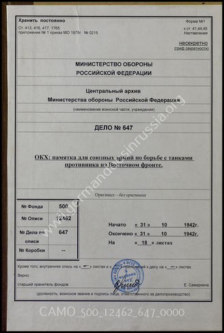 Akte 647: Unterlagen der kriegsgeschichtlichen Verwaltung des Generalstabes der Streitkräfte der Russischen Föderation: Übersetzung von Unterlagen der Abteilung schnelle Truppen im OKH – Merkblatt für die Panzerbekämpfung im Osten, 31.10.1942