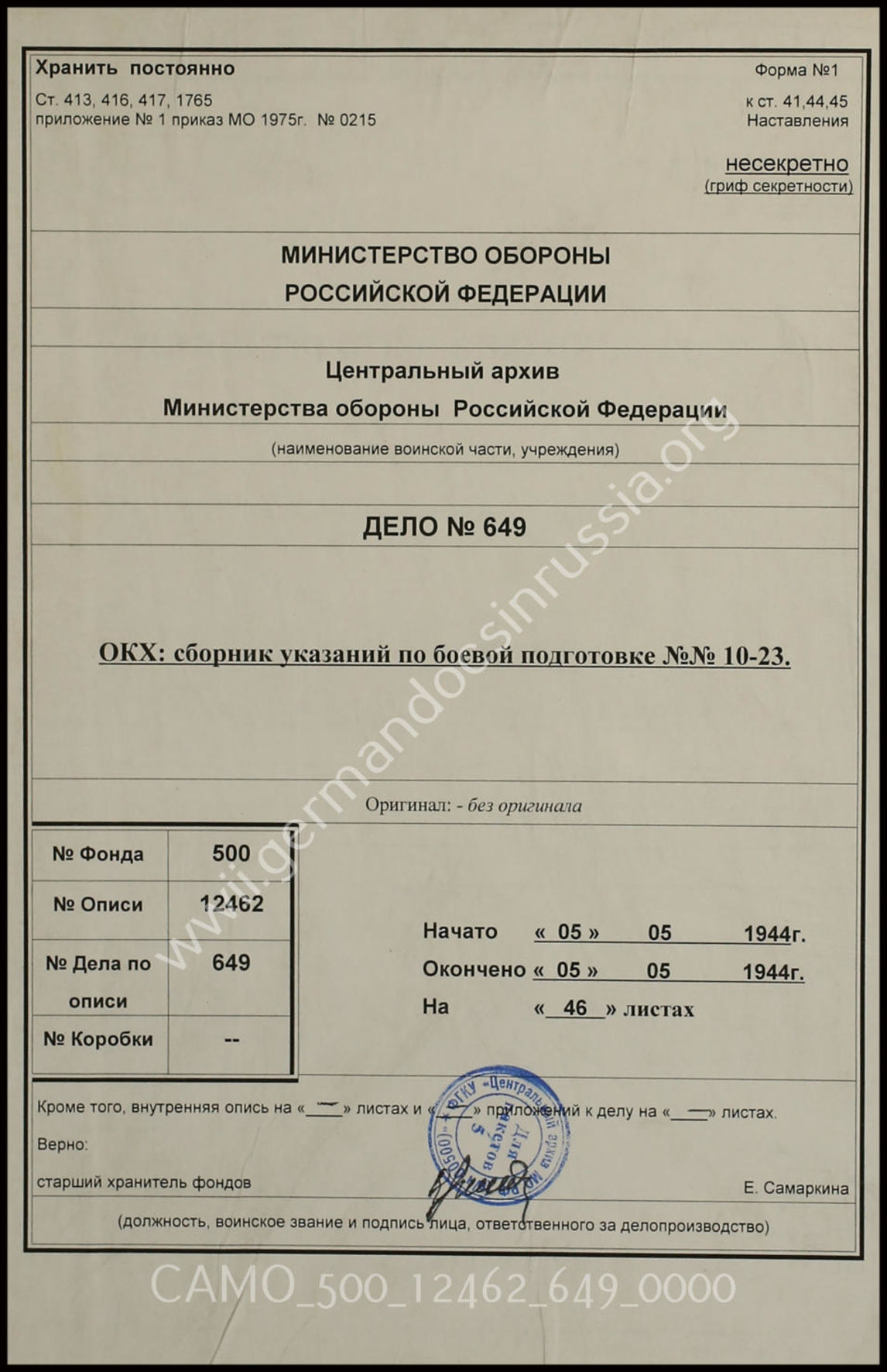 Akte 649: Unterlagen der kriegsgeschichtlichen Verwaltung des Generalstabes der Streitkräfte der Russischen Föderation: Übersetzung von Unterlagen der Ausbildungsabteilung im OKH – Sammlung der Merkblätter Nr. 10-23 für die Gefechtsausbildung, 5.5.1944
