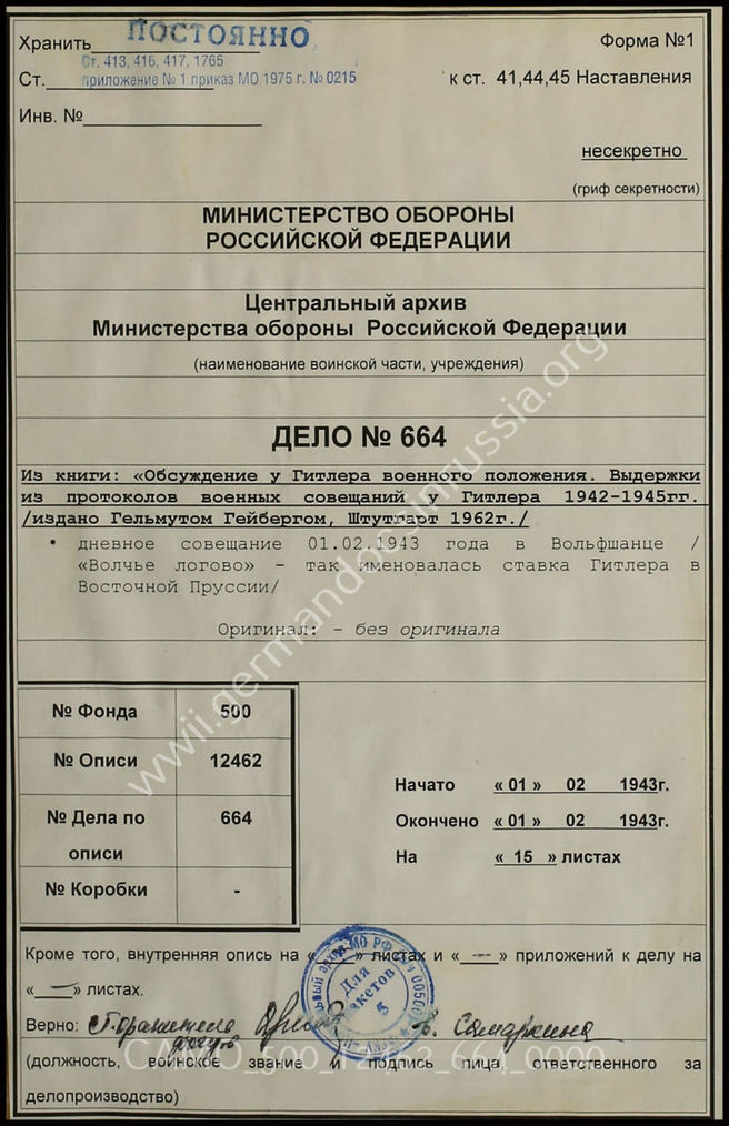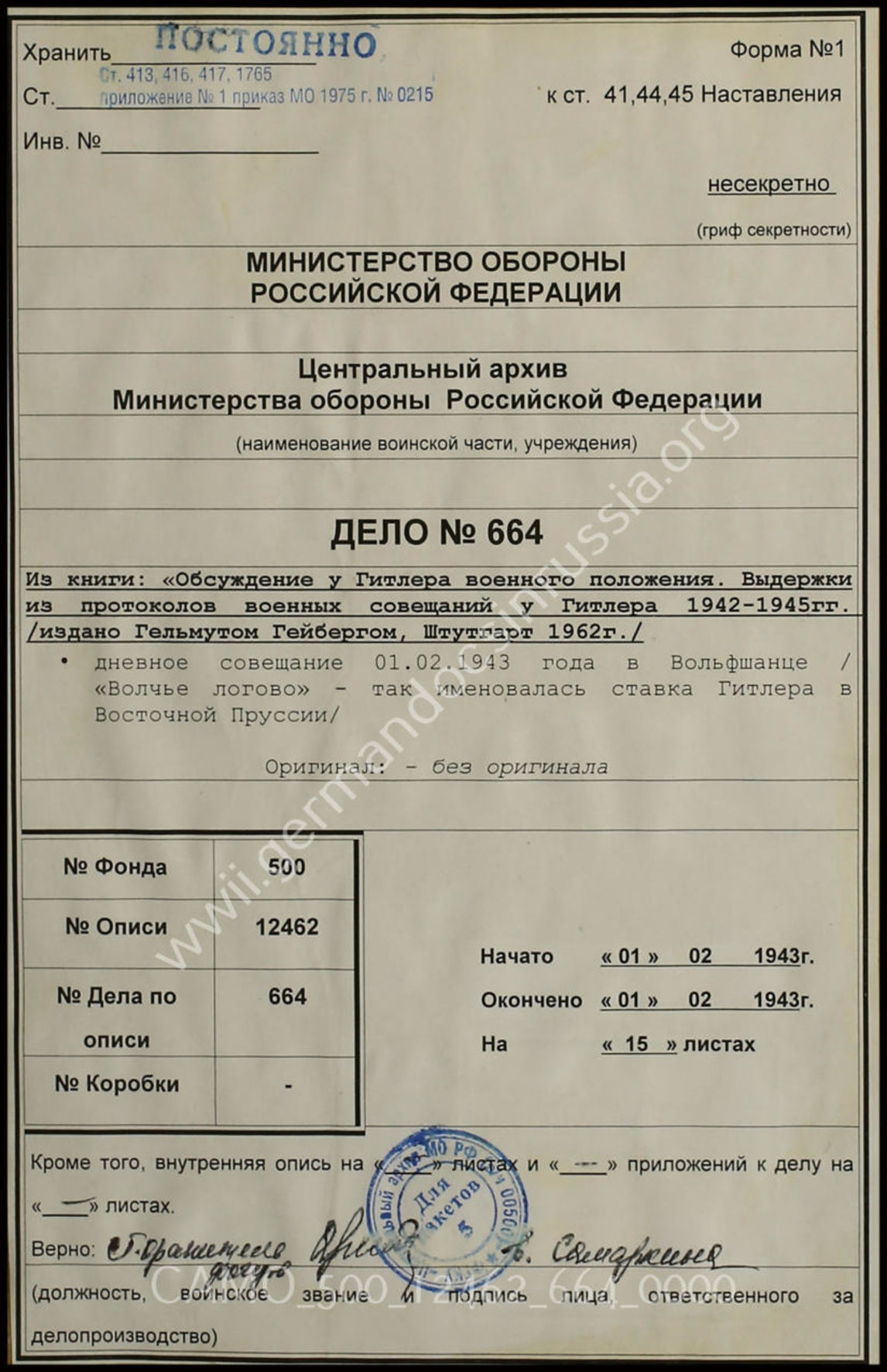 Akte 664: Unterlagen der kriegsgeschichtlichen Verwaltung des Generalstabes der Streitkräfte der UdSSR: Protokolle der Lagebesprechungen Hitlers am 1. Februar 1943 – aus Heiber: Lagebesprechungen im Führerhauptquartier, Stuttgart 1962, S. 120-127
