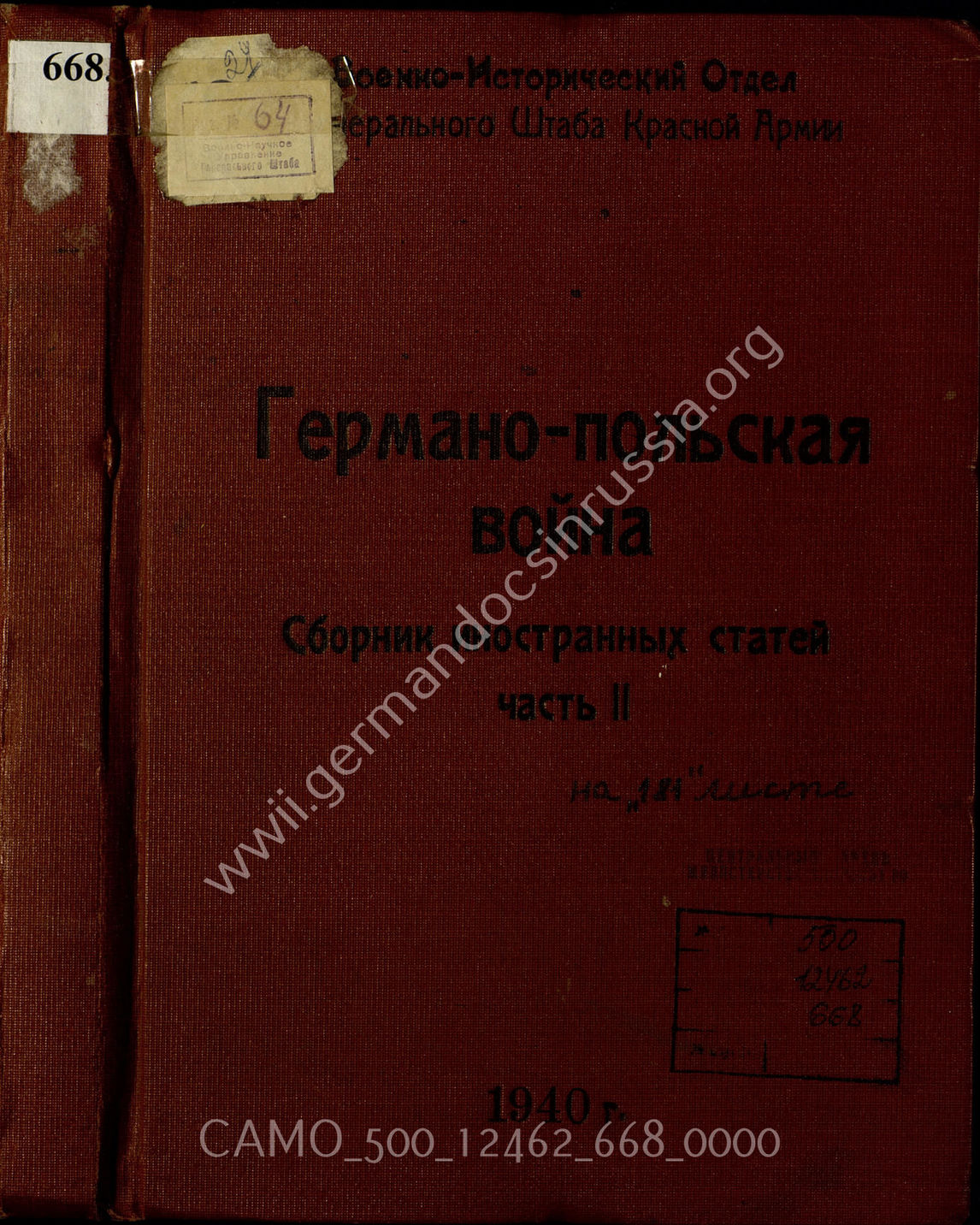 Akte 668: Unterlagen der kriegsgeschichtlichen Verwaltung des Generalstabes der Streitkräfte der UdSSR: Sammlung der kriegsgeschichtlichen Abteilung des Generalstabes der Roten Armee von ausländischen Beiträgen zum deutsch-polnischen Krieg, Teil 2, 1940
