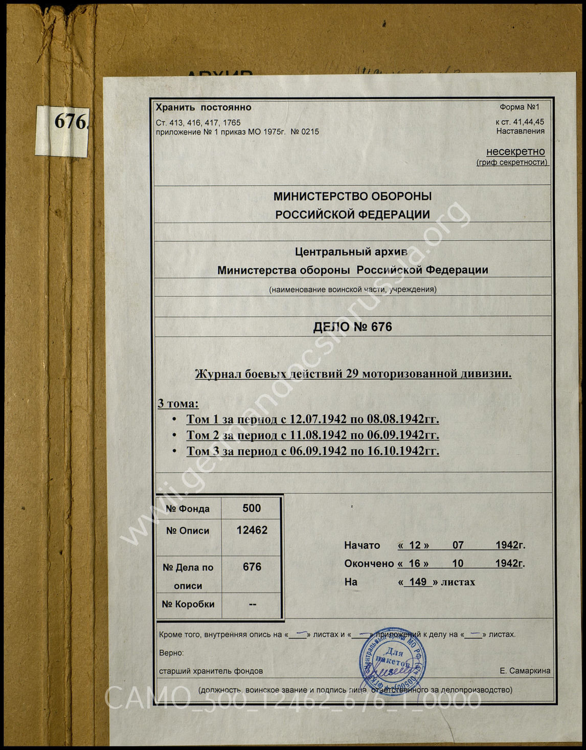 Akte 676: Unterlagen der kriegsgeschichtlichen Verwaltung des Generalstabes der Streitkräfte der UdSSR: Übersetzung von Unterlagen der Ia-Abteilung 29. Infanteriedivision (mot.) – KTB der 29. Infanteriedivision (mot.), Bd. 1-3, 12.7.-16.10.1942