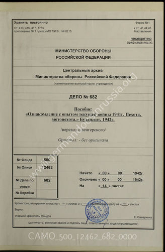Top CAMO - Bestand 500 Findbuch 12462 - russische Übersetzungen deutscher Akten Akte 682: Unterlagen der kriegsgeschichtlichen Verwaltung des Gener...