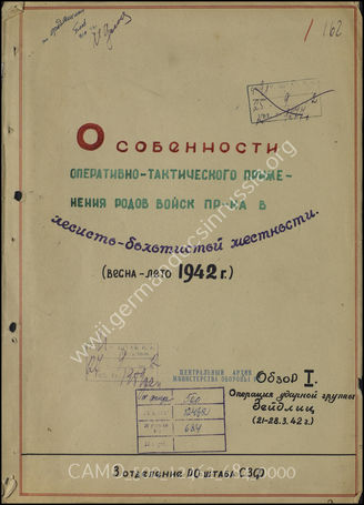 Akte 684: Unterlagen der kriegsgeschichtlichen Verwaltung des Generalstabes der Streitkräfte der UdSSR: Unterlagen der Nordwestfront – Ausarbeitung „Besonderheiten des Einsatzes deutscher Truppen in Waldgebieten", 21.3.1942-28.3.1942