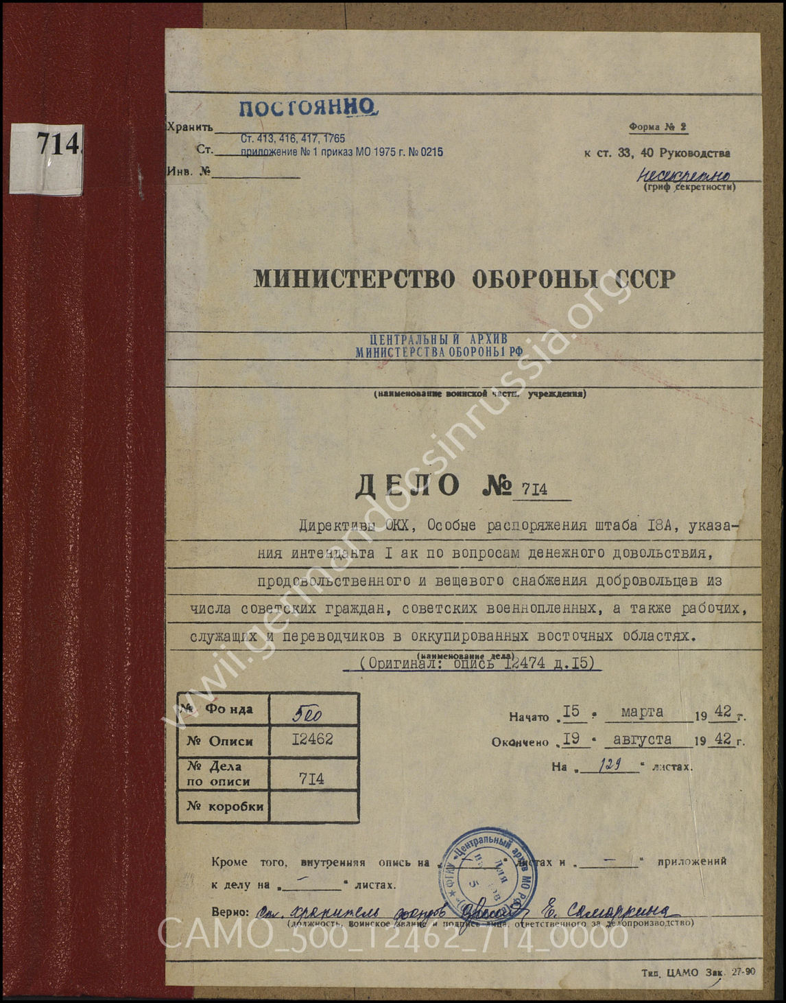Akte 714: Unterlagen des Übersetzungsbüros des 6. Archivdepots des CAMO: Übersetzung von Unterlagen des Korpsintendanten des I. Armeekorps: Befehle und Weisungen zur Abfindung, Fürsorge und Versorgung von Hilfswilligen u.a., 15.3.1942-2.3.1943