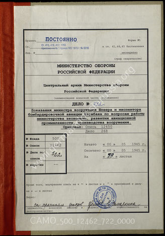 Akte 722: Unterlagen des Übersetzungsbüros des 6. Archivdepots des CAMO: Übersetzung der Aussagen von Speer und des Generals der Kampfflieger Werner Baumbach zu Fragen der Arbeit des Reichministerium für Rüstung und Kriegsproduktion, 17.5.1945