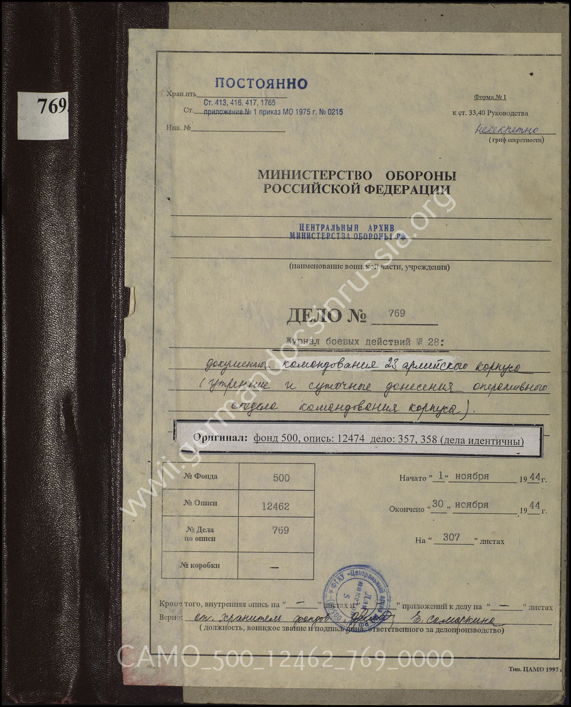 Akte 769: Unterlagen des Übersetzungsbüros des 6. Archivdepots des CAMO: Übersetzung von Unterlagen des Generalkommandos des XXIII. Armeekorps – KTB Nr. 28, 1.11.1944-30.11.1944