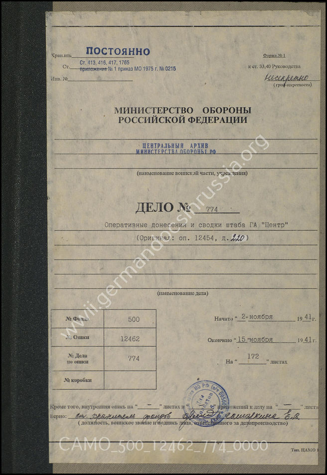 Akte 774: Unterlagen des Übersetzungsbüros des 6. Archivdepots des CAMO: Übersetzung von Unterlagen der Ia-Abteilung der Heeresgruppe Mitte – Tages-, Zwischen- und Morgenmeldungen des Ia der Heeresgruppe Mitte, 2.11.1941-15.11.1941