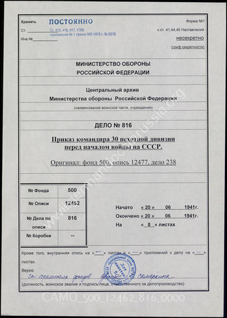 Akte 816: Unterlagen des Übersetzungsbüros des 6. Archivdepots des CAMO: Übersetzung von Unterlagen der Ia-Abteilung der 30. Infanteriedivision – Divisionsbefehl für den Angriff gegen die Sowjetunion, 20.6.1941