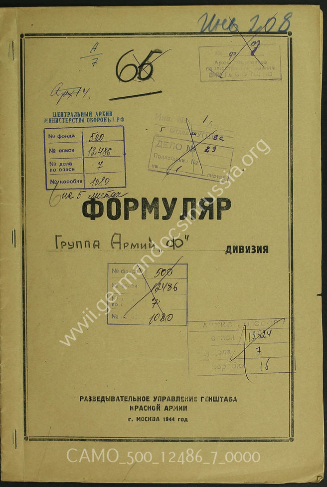 Akte 7: Unterlagen der Aufklärungsverwaltung des Generalstabes der Roten Armee: Aufklärungsinformationen zur Heeresgruppe F– Erfassungsbögen mit Informationen über die Heeresgruppe