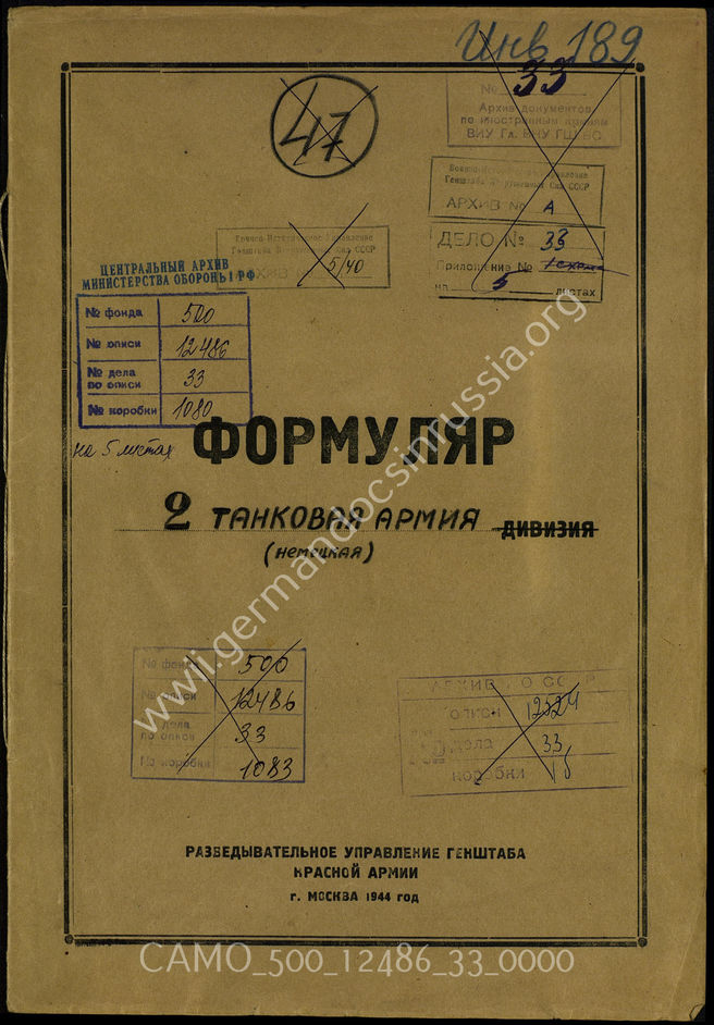 Akte 33: Unterlagen der Aufklärungsverwaltung des Generalstabes der Roten Armee: Erfassungsbögen. mit Aufklärungsinformationen zur 2. Panzerarmee, Gliederungsübersicht u.a.