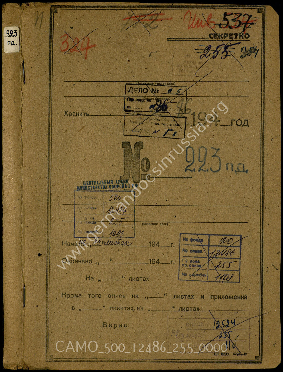 Akte 255: Unterlagen der Aufklärungsverwaltung des Generalstabes der Roten Armee: Erfassungsbögen mit Aufklärungsinformationen zur 223. Infanteriedivision, Verhöre von Kriegsgefangenen und Überläufern, übersetzte Beutedokumente, Auskunftsschreiben u.a.