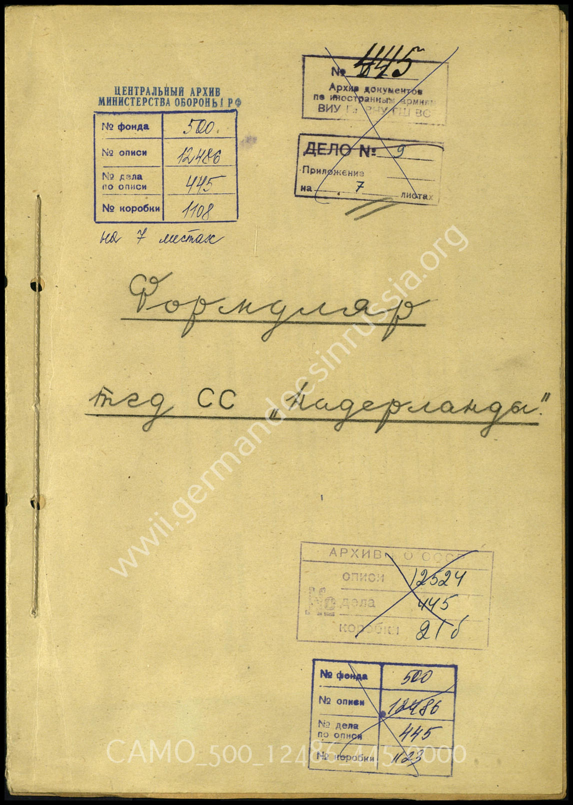Akte 445: Unterlagen der Aufklärungsverwaltung des Generalstabes der Roten Armee: Erfassungsbögen mit Aufklärungsinformationen zur 4. SS-Freiwilligen-Panzergrenadierbrigade „Nederland“