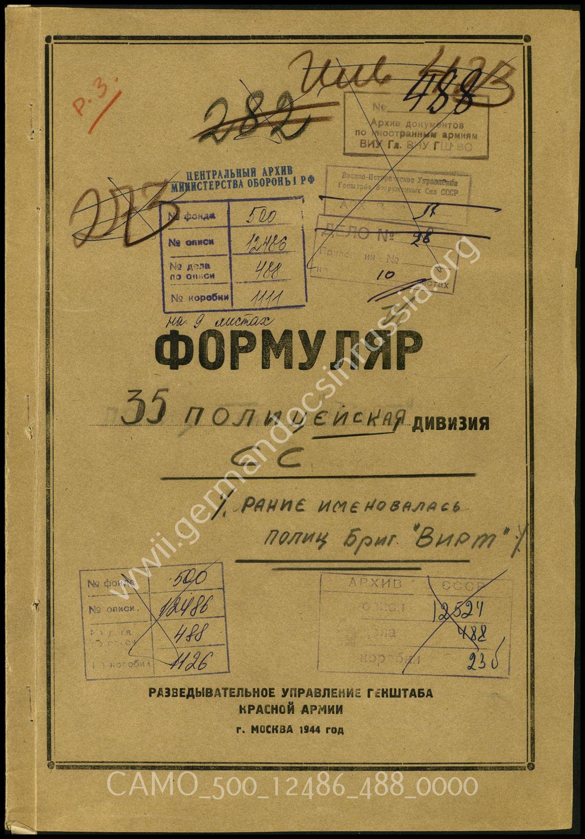 Akte 488: Unterlagen der Aufklärungsverwaltung des Generalstabes der Roten Armee: Erfassungsbögen mit Aufklärungsinformationen zur 35. SS-Polizei-Grenadierdivision (aus der SS-Polizeibrigade Wirth hervorgegangen), Auskunftsschreiben
