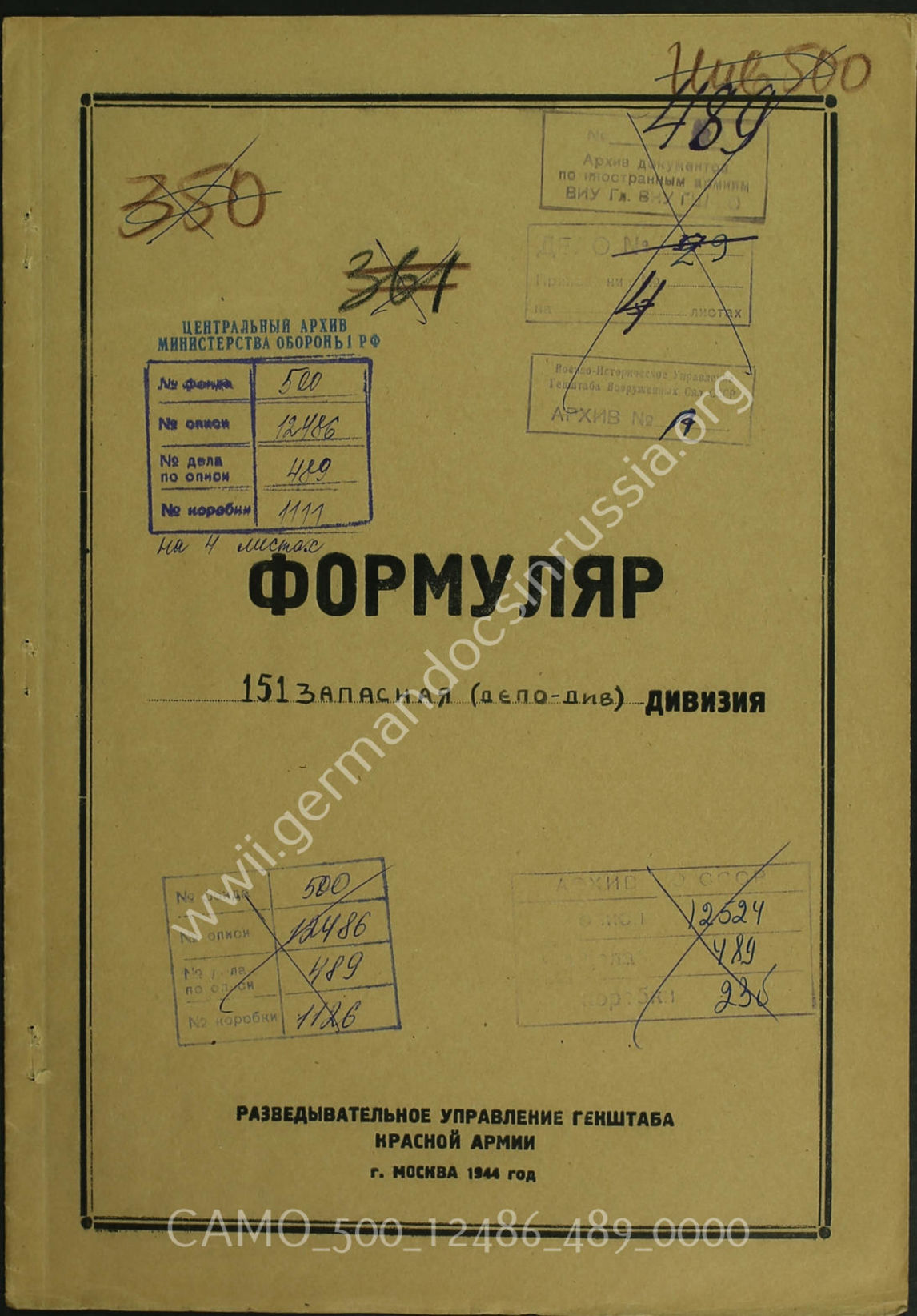 Akte 489: Unterlagen der Aufklärungsverwaltung des Generalstabes der Roten Armee: Erfassungsbögen mit Aufklärungsinformationen zur 151. Reservedivision