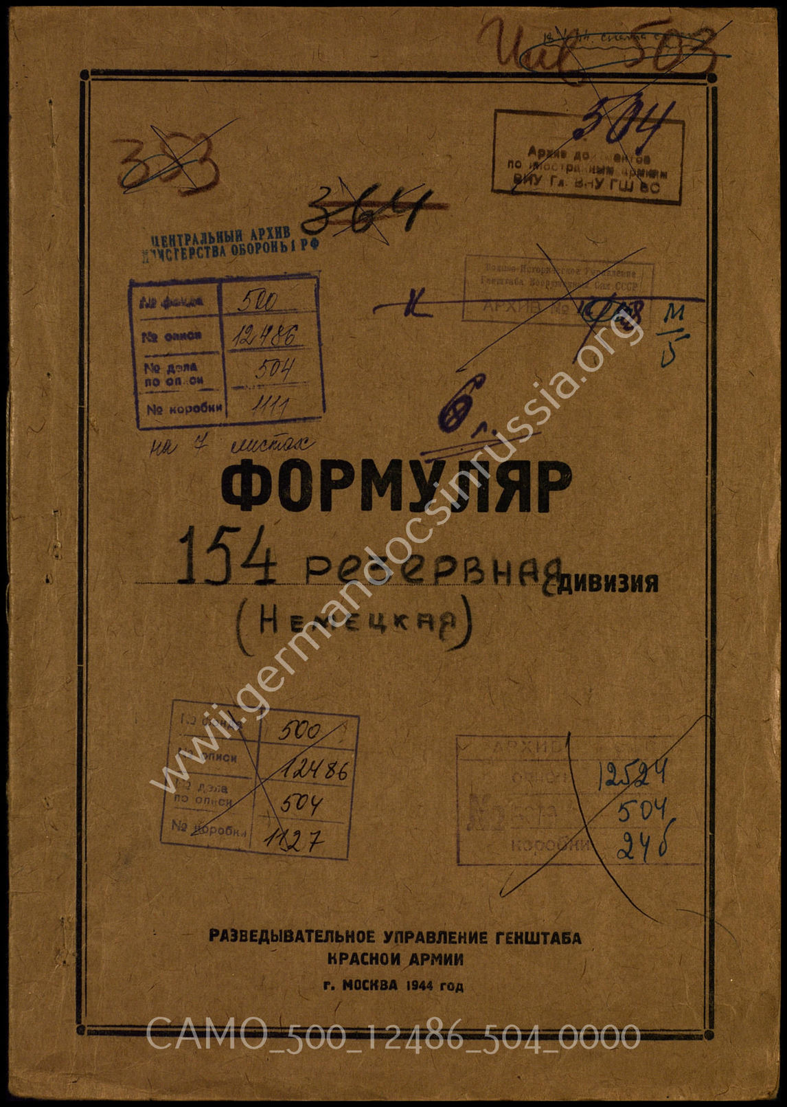 Akte 504: Unterlagen der Aufklärungsverwaltung des Generalstabes der Roten Armee: Erfassungsbögen mit Aufklärungsinformationen zur 154. Reservedivision, Auskunftsschreiben, Verhör des kriegsgefangenen Soldaten Erik Schmalz
